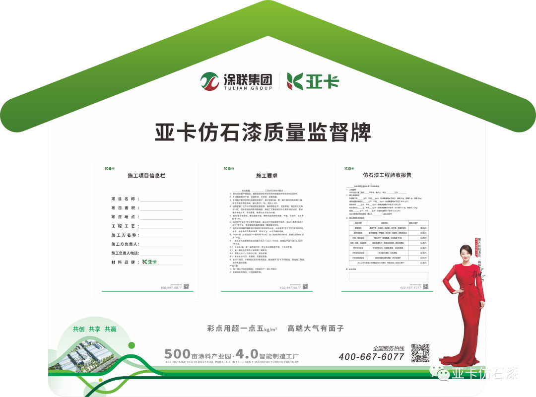 亞卡為客戶定制質(zhì)量監(jiān)督牌,讓每位業(yè)主參與并看到亞卡施工師傅的每道工藝按標(biāo)準(zhǔn)施工,確保流程、次數(shù)、用量,關(guān)鍵彩點(diǎn)用量超出1.5KG/平方,讓亞卡仿石漆在每家業(yè)主墻上呈現(xiàn)逼真仿石效果,在效果端堅(jiān)守品質(zhì)。