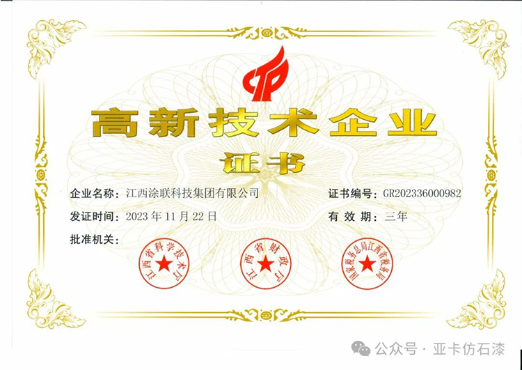 科學(xué)是發(fā)展的重要內(nèi)在推動(dòng)力,涂聯(lián)集團(tuán)攜手旗下自主品牌亞卡涂料自成立以來,大力優(yōu)化調(diào)整產(chǎn)業(yè)結(jié)構(gòu),走自主創(chuàng)新、持續(xù)創(chuàng)新的發(fā)展道路,提高科技創(chuàng)新能力,最終喜獲國家“高新技術(shù)企業(yè)證書”。