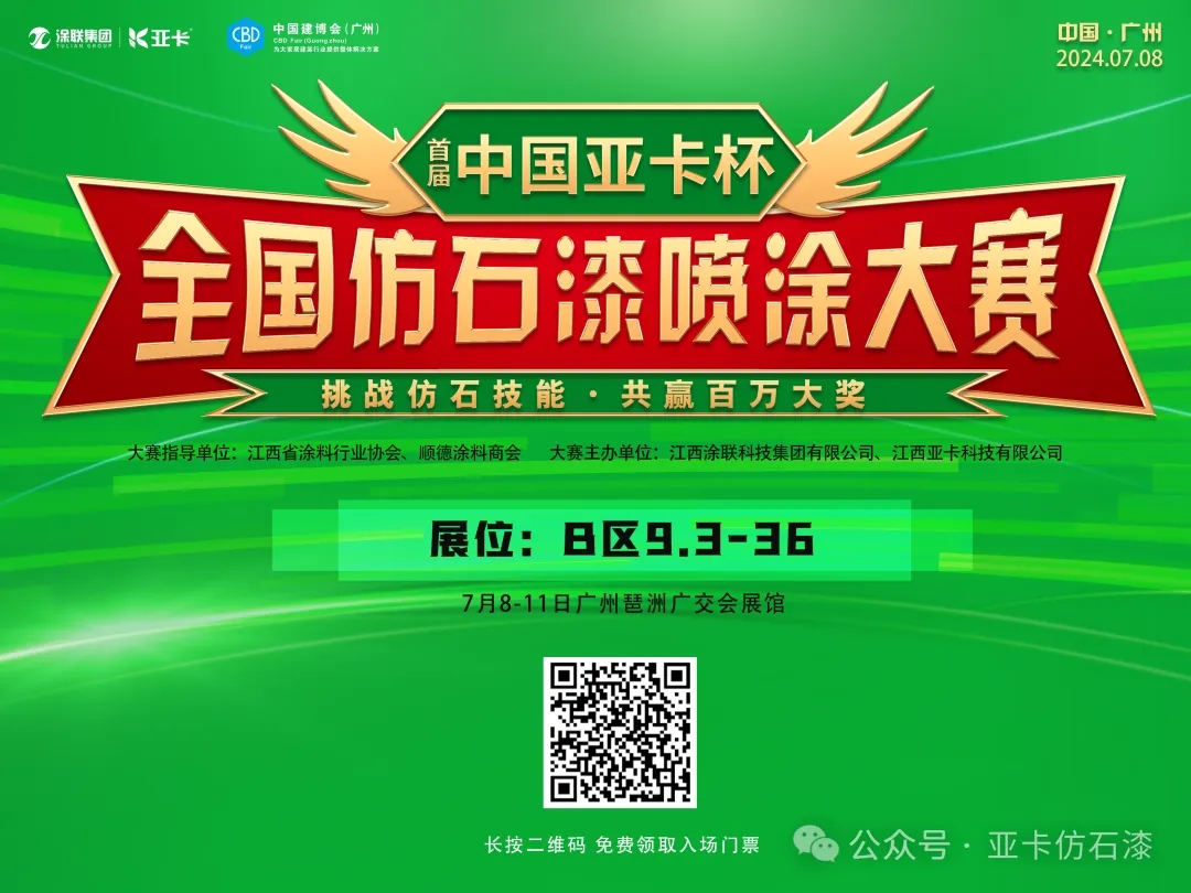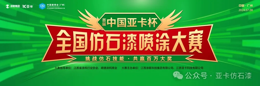 本次大賽由江西省涂料行業(yè)協(xié)會、順利涂料商會共同指導,江西涂聯(lián)科技集團有限公司、江西亞卡科技有限公司主辦。大賽將圍繞質(zhì)感外墻涂裝效果展開激烈角逐,亞卡鉑金石仿石漆、酷彩超石感仿石漆、亞卡亞灰石外墻藝術(shù)涂料將作為大賽指定材料,各參賽區(qū)域用精湛的技藝和獨特的創(chuàng)意,為大眾呈現(xiàn)出一幅幅精美絕倫的外墻作品。